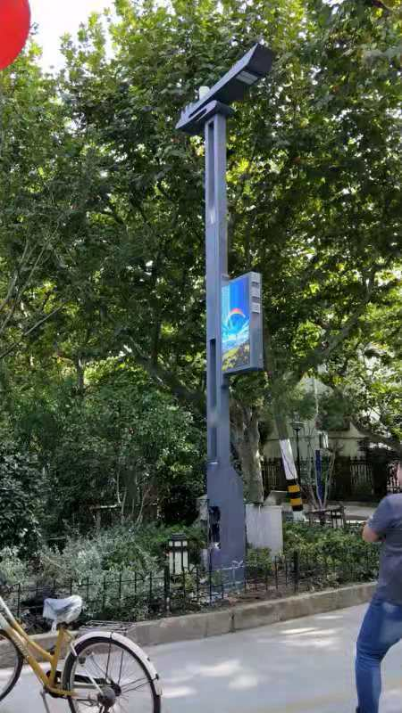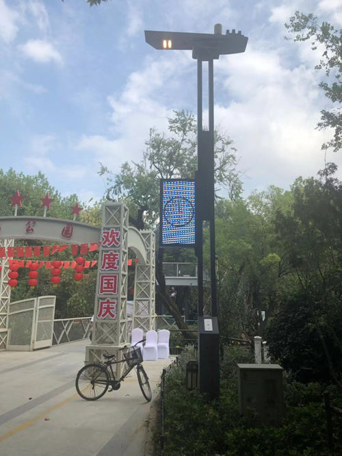曹杨公园此项目包含智慧照明、环境检测、信息发布、城市广播、一键报警、智慧e盒等功能应用,曹杨公园的智慧灯杆针对公园原有杆体设施老旧、照明亮度不够且不节能、网络设备陈旧等问题进行了改造。在外观设计上,选用雨青色杆体,与公园的垂柳相搭配,融入了公园的风景,展现出中国风特色。