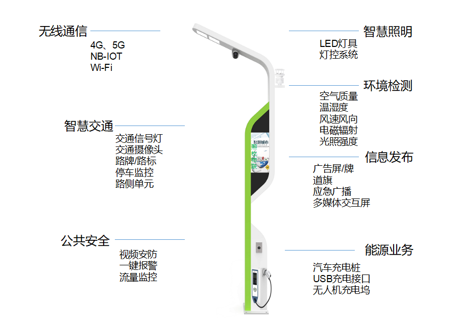 根据中国通信企业协会发布的《智慧灯杆总规范》,智慧灯杆是综合使用有线、无线通信技术,集成多种传感器和便民服务设施,具备照明、监控、环境信息采集、基站、广播、信息屏、充电桩等多种功能的智慧城市基础设施。智慧灯杆搭载多种设备(LED灯具、信号灯、路牌/路标、WIFI/5G微基站、广告屏、充电桩、视频监控系统等)和传感器(风速计、湿度/温度传感器、摄像头等),这些设备和传感器通过各种通信技术接入网络和平台,并在物联网、大数据、人工智能等技术赋能下实现智慧应用。